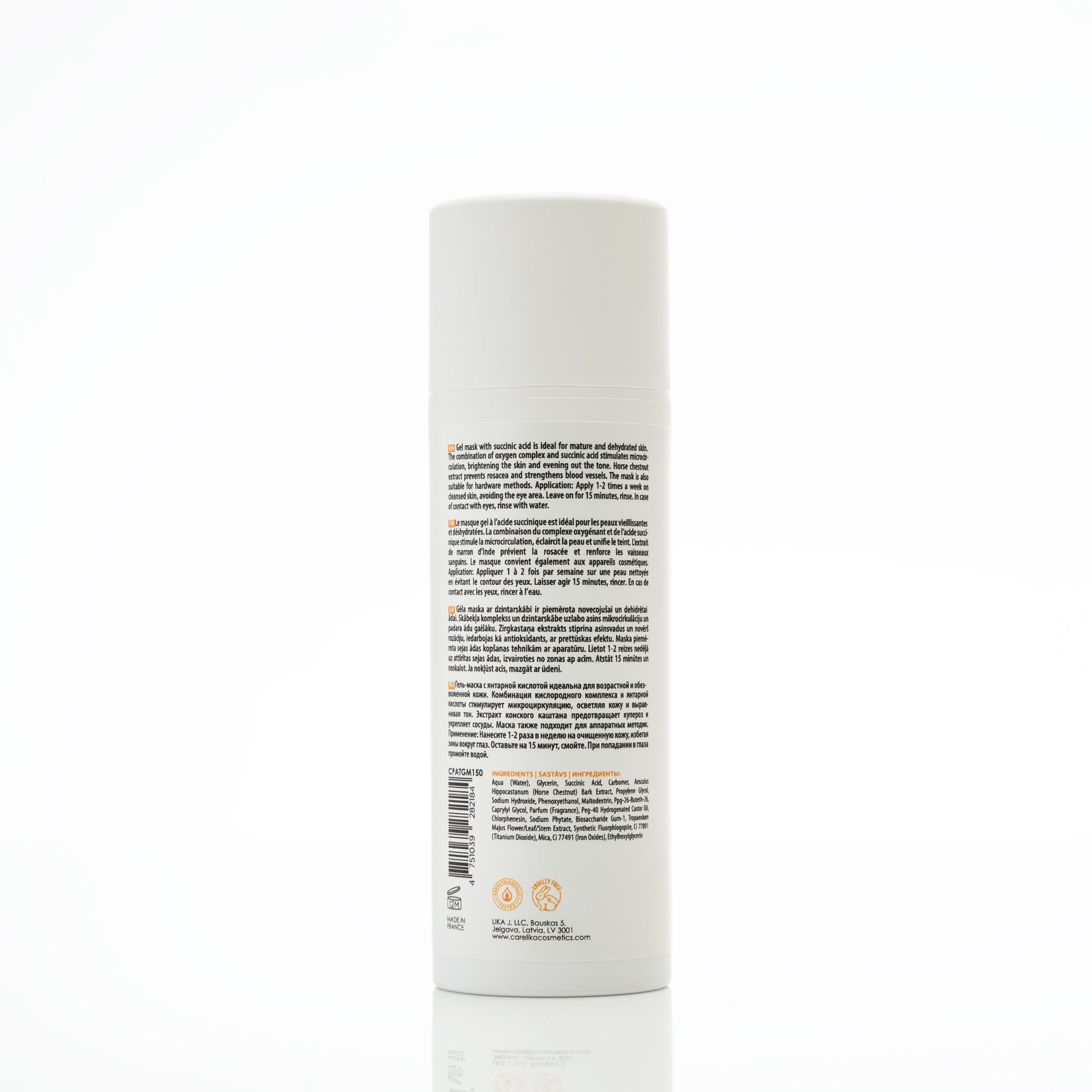 Gel-mask based on succinic acid is suitable for mature, dull and dehydrated skin. The combination of an oxygen complex and succinic acid improves energy exchange in tissues and blood microcirculation, saturates cells with oxygen, delicately brightening the skin and evening out the tone of the face. Horse chestnut extract reduces capillary permeability, increases vascular tone and prevents rosacea. It has an antioxidant, anti-edematous and anti-inflammatory effect. The gel mask can be used on its own, as well as in combination with hardware methods - iontophoresis, microcurrents and phonophoresis.