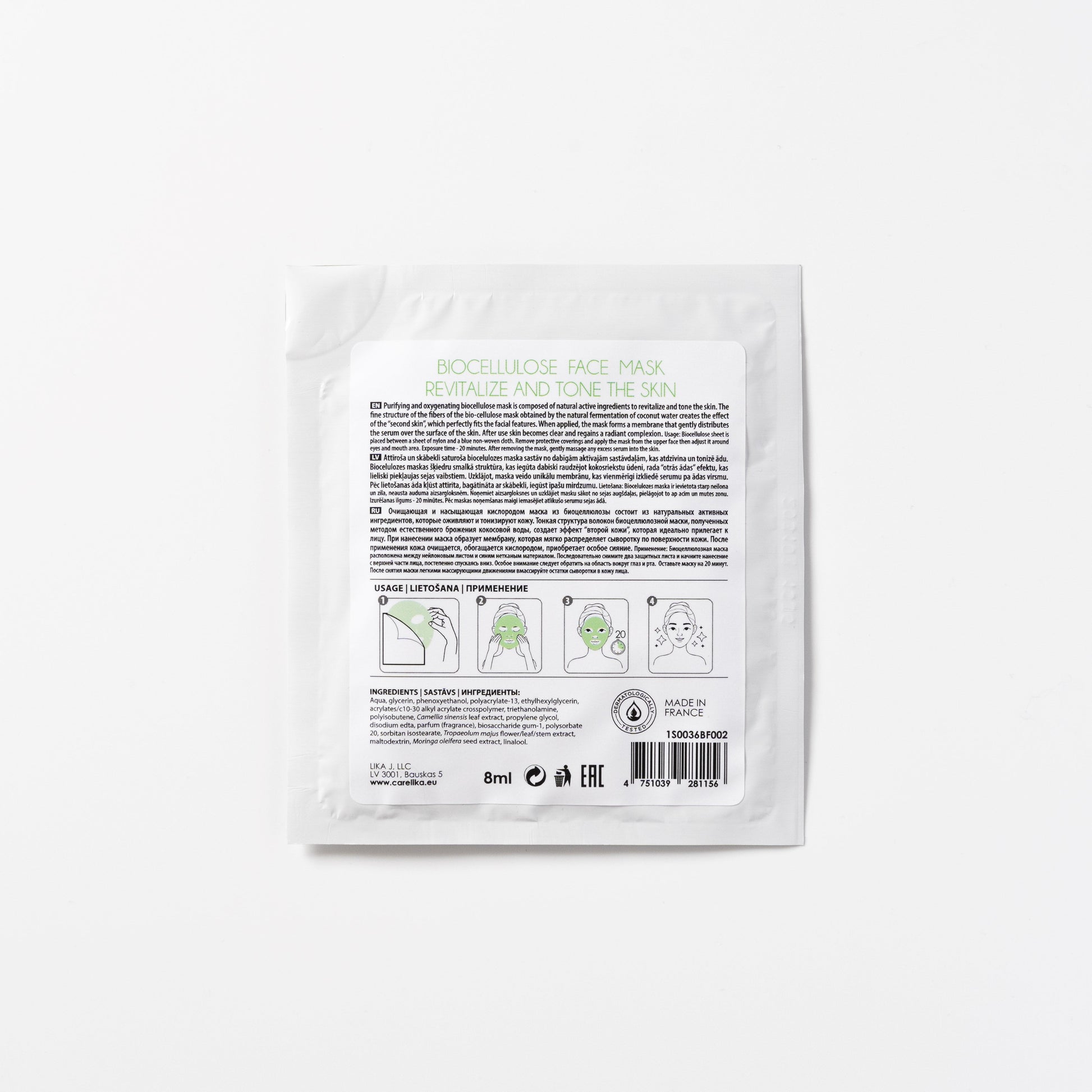 The CARELIKA Biocellulose Face Mask Purifying and enriched with Oxygen comprises cleansing and nourishing ingredients that give a rejuvenated look. Soaked in the novel ingredient OXYGESKIN® this mask fights stress due to lower oxygen levels in the skin layers and replenishes it with healthy oxygen. Green tea extract detoxifies and revitalizes with its antioxidant effects. It also contains Fucogel® and Purisoft® that pamper your skin and restore your beauty by fighting pollution-related stress.