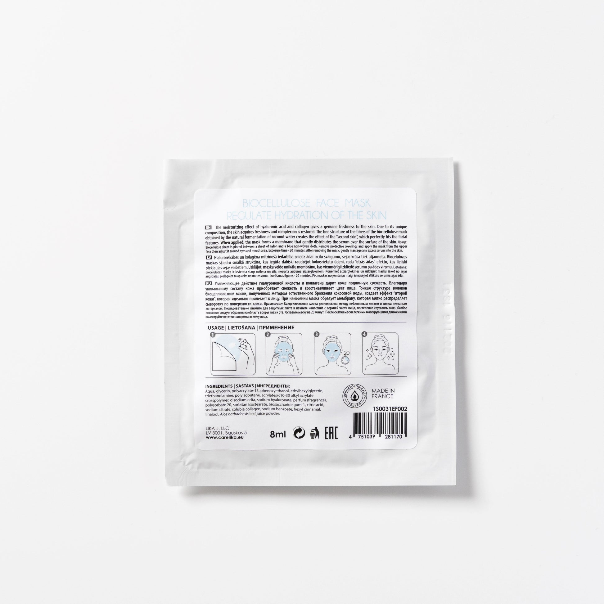 Millions of nanofibres of biocellulose hold a huge volume of active ingredients and deliver them to the finest facial wrinkles for rapid recovery. Extremely elastic and resistant to tearing, the mask adapts to facial contour quickly. Enjoy the ultimate comfort of this smooth user-friendly hypoallergenic mask as your skin soak nutrients to leave you energized!
