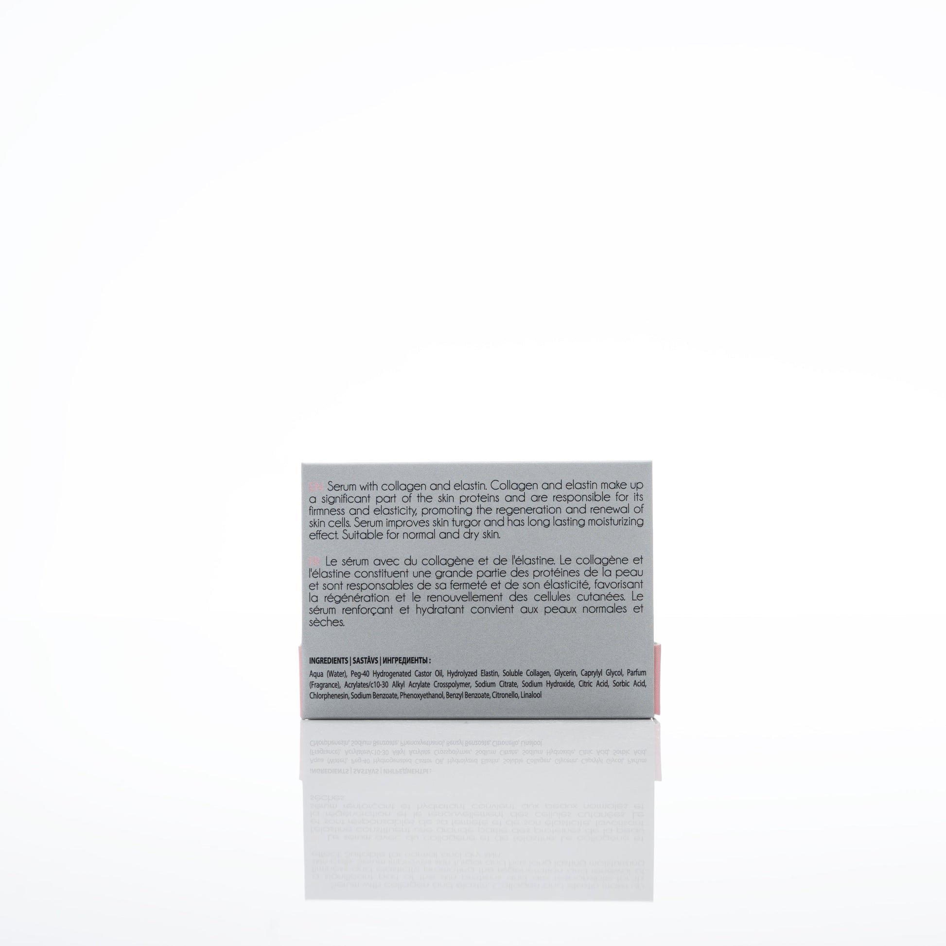 Aqua (water), peg-40 hydrogenated castor oil, hydrolyzed elastin, soluble collagen, glycerin, caprylyl glycol, parfum (fragrance), acrylates/c10-30 alkyl acrylate crosspolymer, sodium citrate, sodium hydroxide, citric acid, sorbic acid, chlorphenesin, sodium benzoate, phenoxyethanol, benzyl benzoate, citronello, linalool