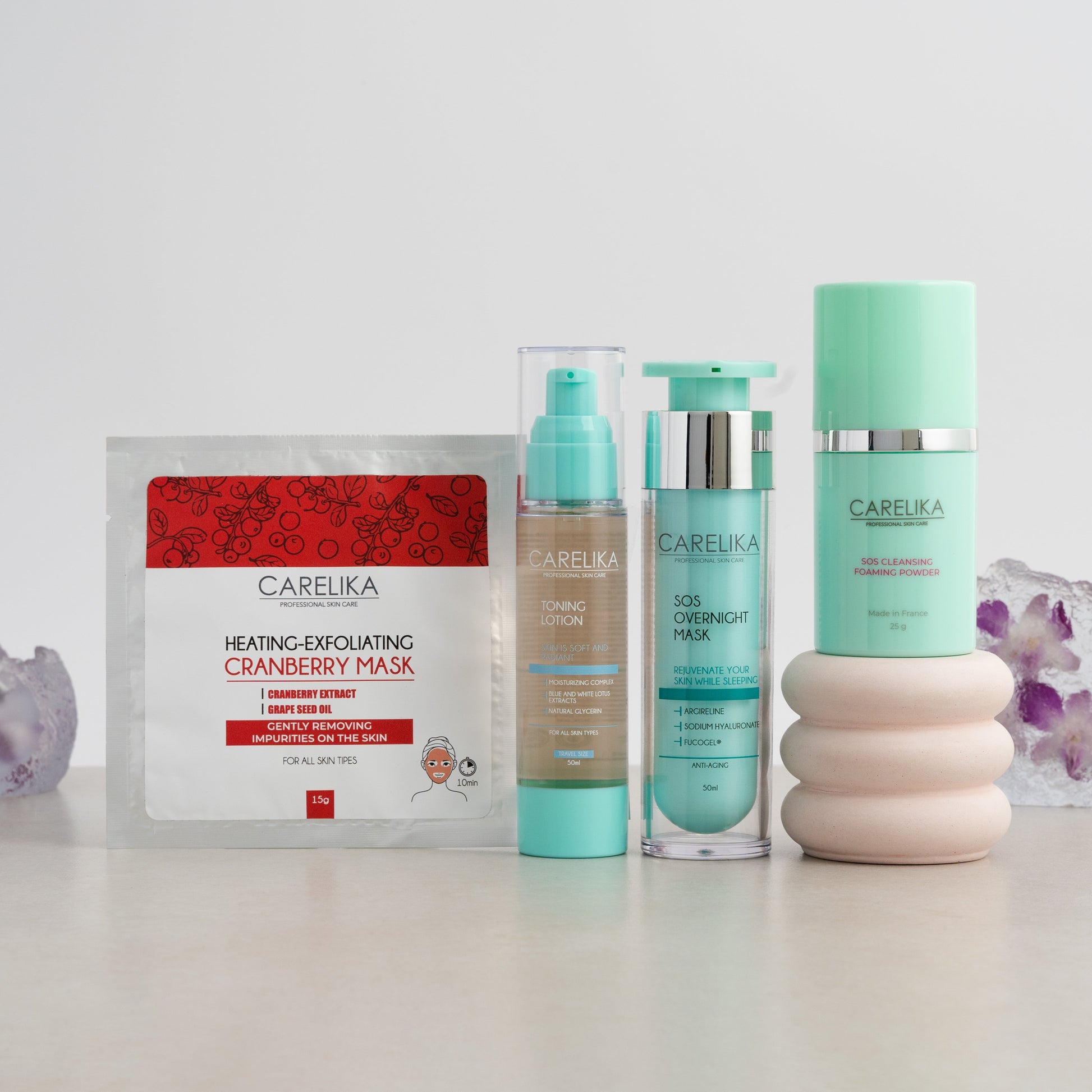 Try Carelika’s Express lifting kit. We have combined an SOS cleansing foaming powder that deeply cleanses your skin and balances the sebum secretion. With a toning liquid that hydrates to maintain a perfect skin tone. You can then indulge in two different face masks for instant facelifting. For an exfoliating effect use a heating mask with cranberry extract that provides nourishment and antioxidants. The overnight mask stimulates a sense of serenity and induces restful sleep. As you sleep the powerful agireline from the mask slowly contracts facial muscles without any discomfort while the hyaluronate and fucogel make your skin look plump and bouncy!